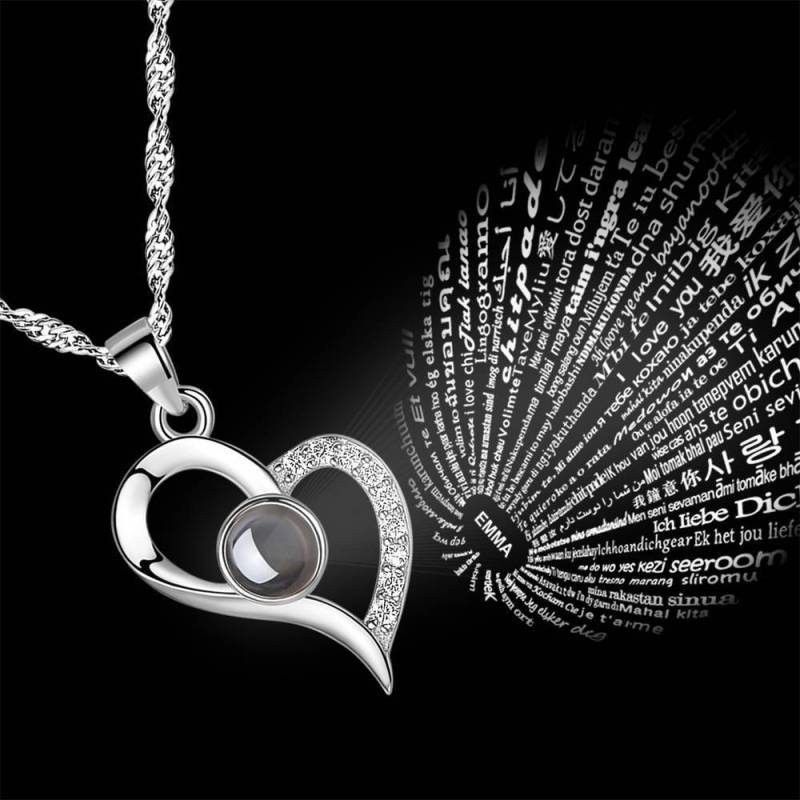 Collana Di Proiezione Con Incisione Personalizzata In 100 Lingue Dice Ti Amo Cuore D'Argento